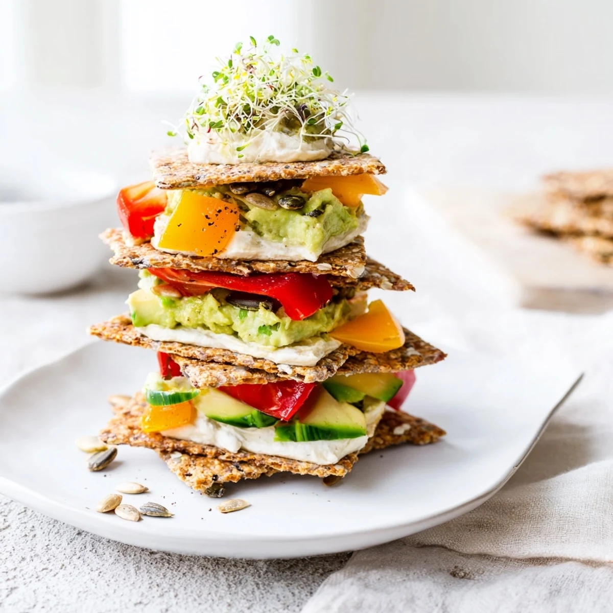 - Dies ist der magische Teil. Wiederhole das Schichten: Cracker, Spread, Brot, verschiedene Beläge. Mit jeder Schicht ändert sich die Farbe und Textur. Nach der Gurke und Tomate könnten Avocado und Radieschen folgen, dann Paprika und Microgreens. Drücke sanft beim Stapeln, um Stabilität zu schaffen, aber nicht so fest, dass du die Beläge quetschst.