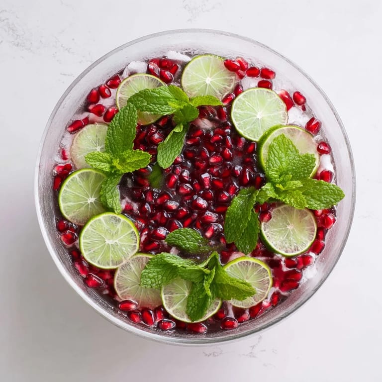 Merken Ein festliches, lebendiges Urlaubsgetränk mit prickelndem Granatapfel, frischer Minze und Zitrusfrüchten, perfekt für Zusammenkünfte.