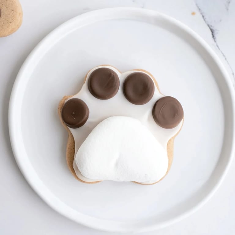 - Jeweils einen großen Marshmallow nahe dem unteren Rand als Tatzenballen aufdrücken. Drei Mini-Schokoladenchips darüber als Zehen platzieren. Je zwei Schokoladenmelts an die Seiten des Marshmallows setzen.