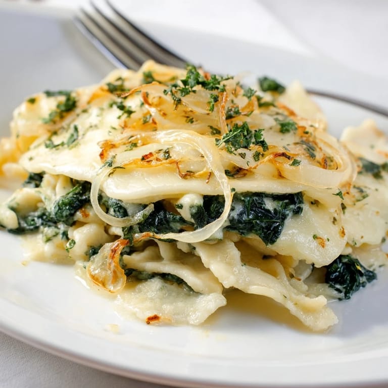 Merken Zarte, schwäbische Spätzle werden hier mit frischem Spinat und cremigem Käse kombiniert und mit goldbraunen Zwiebeln getoppt. Dieses wohltuende vegetarische Gericht passt perfekt zu jedem Anlass.