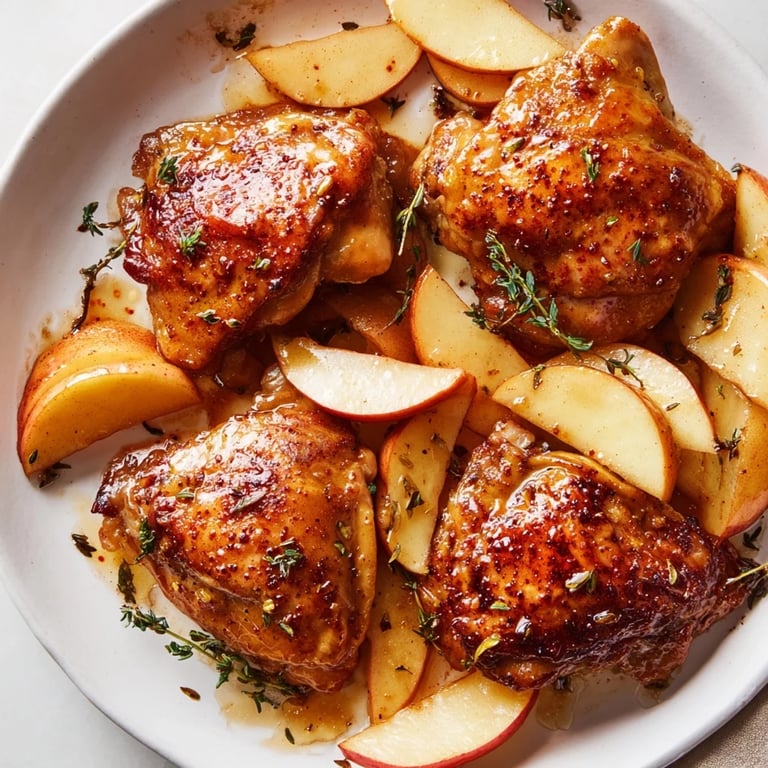 Merken Es war ein unerwarteter Apfelüberschuss an einem Herbstsamstag, der mich dazu brachte, diese klebrigen Hähnchenschenkel zu erfinden – die Äpfel lagen in einer Schüssel auf meinem Küchentisch und warteten auf einen Zweck. Ich wollte etwas Herzhaftes, aber nicht Gewöhnliches, also griff ich zur Ahornsirup-Flasche und dachte an Herbstaromen. Der erste Biss war ein Moment der Klarheit: süß, würzig, golden und so befriedigend, dass ich seit diesem Tag regelmäßig dieses Gericht mache. Die Hähnchenschenkel werden klebrig und karamellig, während die Äpfel an den Rändern knusprig werden – es ist das kulinarische Gegenstück zu einem perfekten Herbsttag.