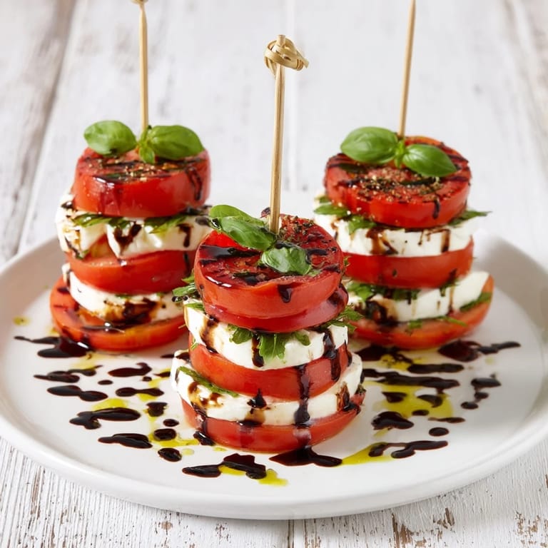 Merken Ich entdeckte diese eleganten Tomaten-Mozzarella-Türme an einem lauen Sommerabend auf einer terrazza in Florenz, wo eine ältere Frau sie mit solcher Leichtigkeit zusammenstellte, als würde sie Blumen arrangieren. Sie lachte, als sie sah, wie ich jede Schicht beobachtete, und sagte, dass die beste Küche oft die einfachste ist. Seitdem kann ich nicht anders, als bei jedem Besuch im Garten an diesen Moment zu denken, wenn die Tomaten rot und süß werden.