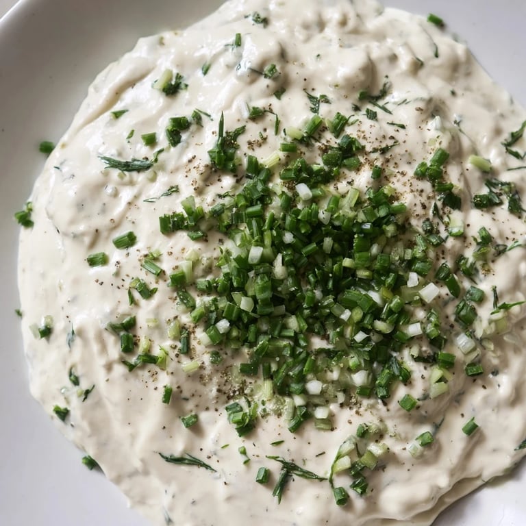 - Den Dip in eine Servierschale geben und großzügig mit zusätzlichem gewürfeltem Schnittlauch garnieren.