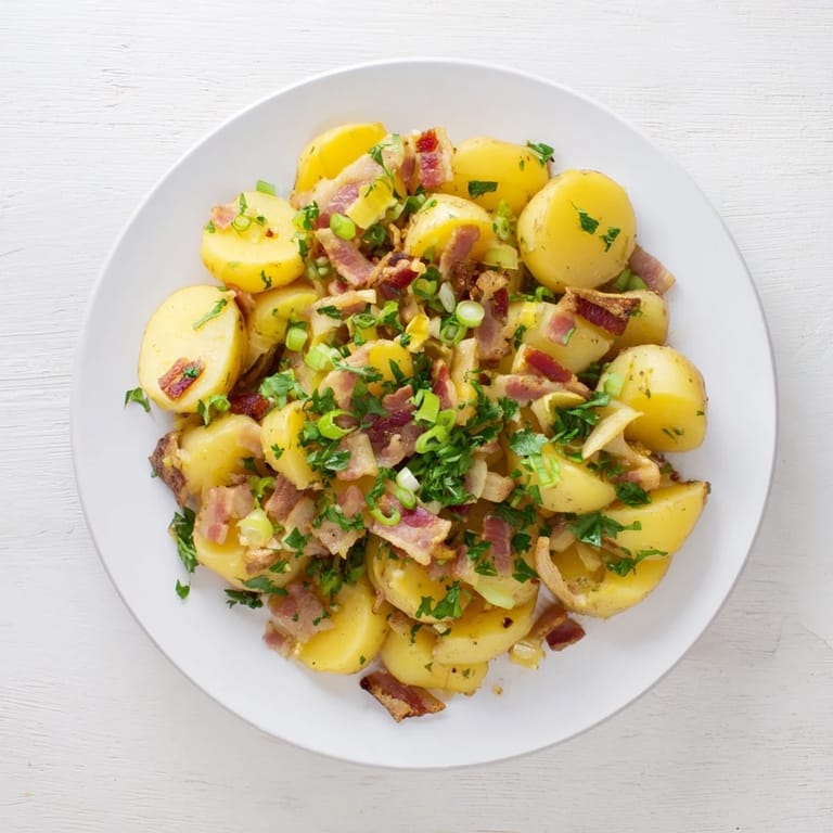 Merken Ein herzhafter, würziger Salat mit zarten Kartoffeln, knusprigem Speck und einem aromatischen Essig-Senf-Dressing. Warm serviert ist dieses klassische deutsche Gericht perfekt als Beilage zu Würstchen, Schnitzel oder gegrilltem Fleisch.