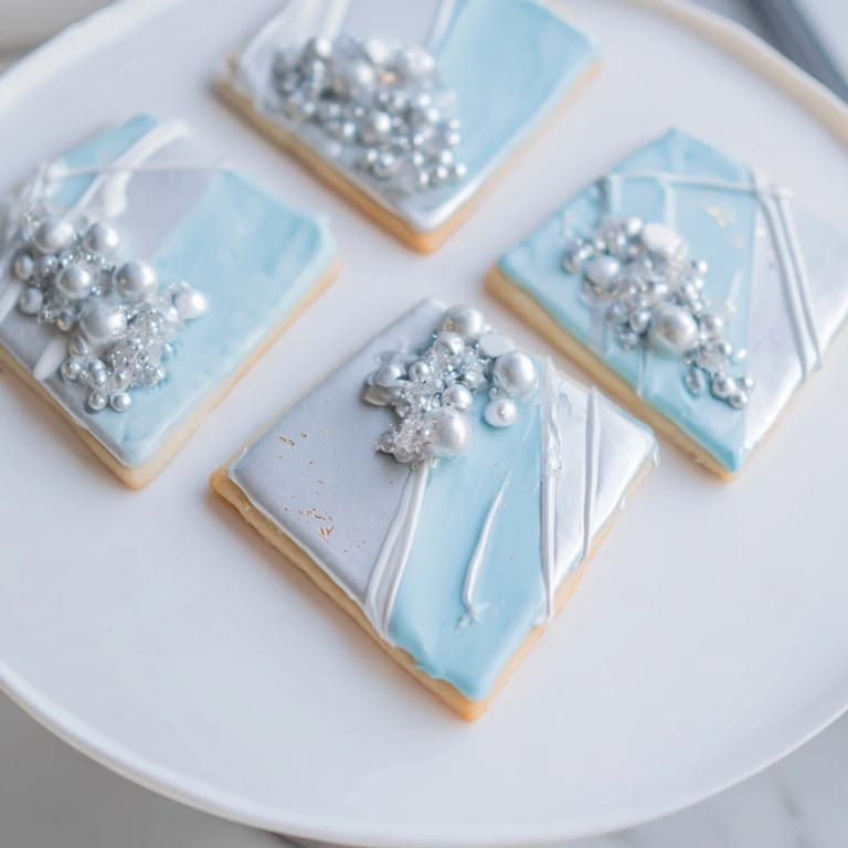 - a. Kekse auf einer dekorativen Platte anrichten. b. Einige mit weißer Schokolade beträufeln und mit essbaren Silberperlen, Perlen oder Blattgold bestreuen. c. Das Tablett mit kandierten Blütenblättern und frischen Beeren elegant garnieren.