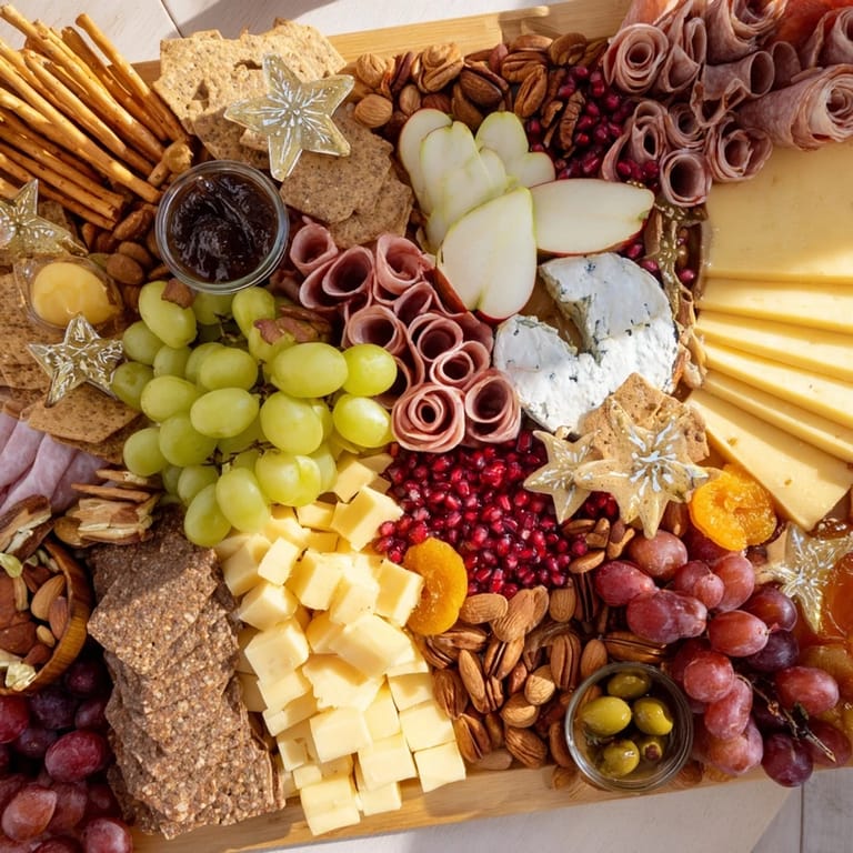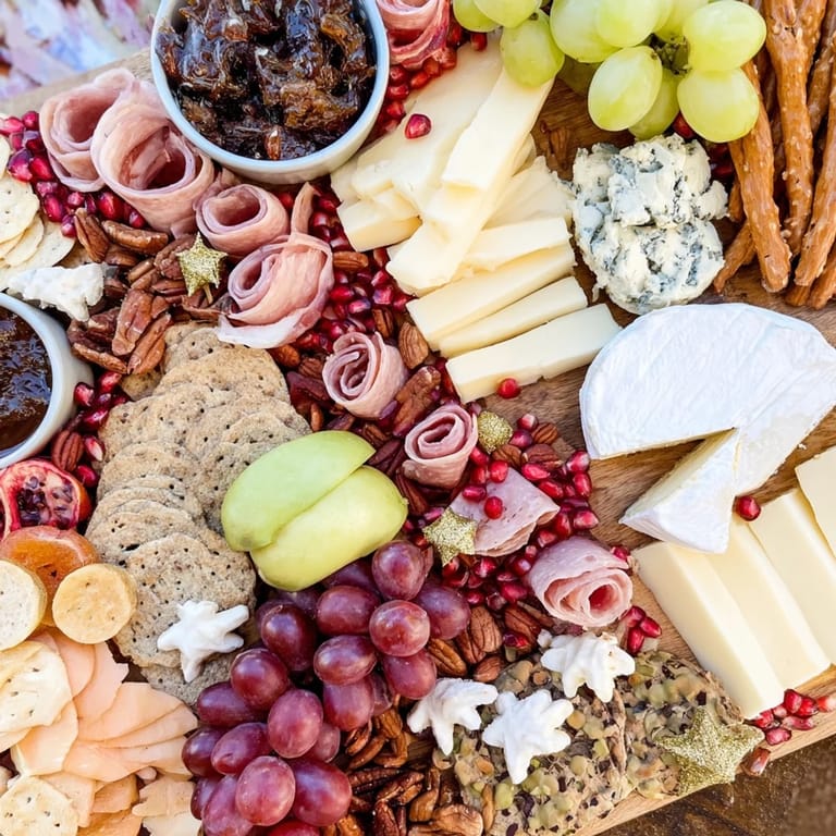 Merken Ein strahlendes, festliches Grazing Board mit einer Mischung aus Käsen, Wurstwaren, Obst, Nüssen und süßen Leckereien, perfekt für ein Feiertagstreffen.